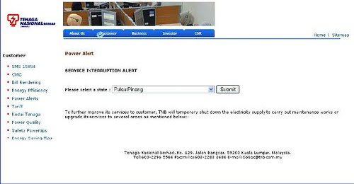 Recently I received several same email from friends to show TNB alert. There are few places will having Power Interrupted soon(lowest 4 hours and highest 11hours for Penang). I am not sure this is temporary announcement or the Alert function already appeared long time ago. By the way, take a look from TNB website (CLICK HERE). Select your location and submit. I just checked mine seem like no related news on me :)